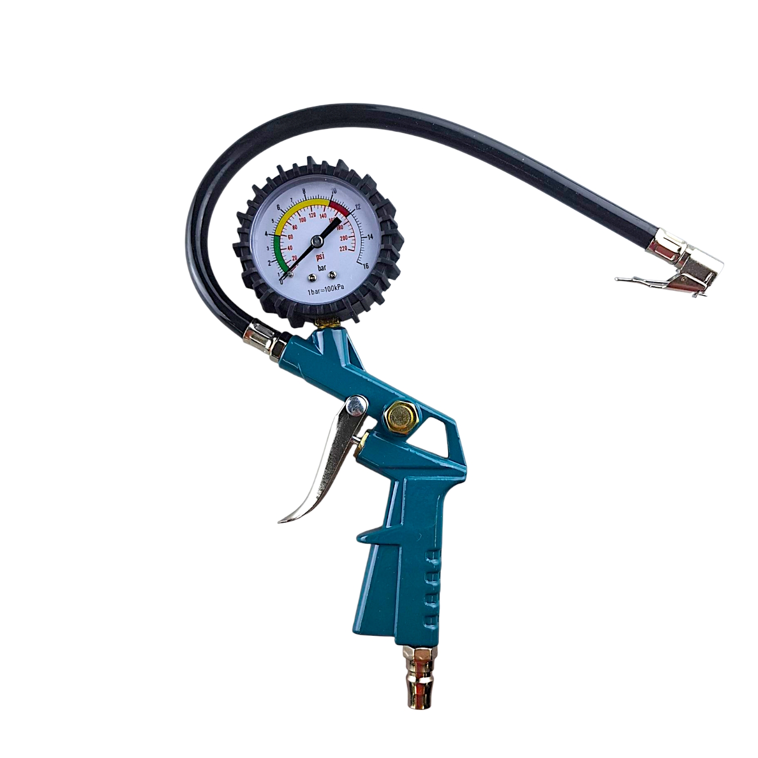 Пистолет с манометром предназначен для измерения давления и подкачки шин. Пневматический пистолет оснащен кнопкой стравливания воздуха и манометром с двойной шкалой, что дает возможность контролировать давление в шинах во время подкачки. Гибкий шланг 36,5 см позволяет производить работы в узких и труднодоступных местах. Легкий алюминиевый корпус прорезинен. Шланг 15 атмосфер и соединение типа рапид созданы для быстрого и удобного подключения.