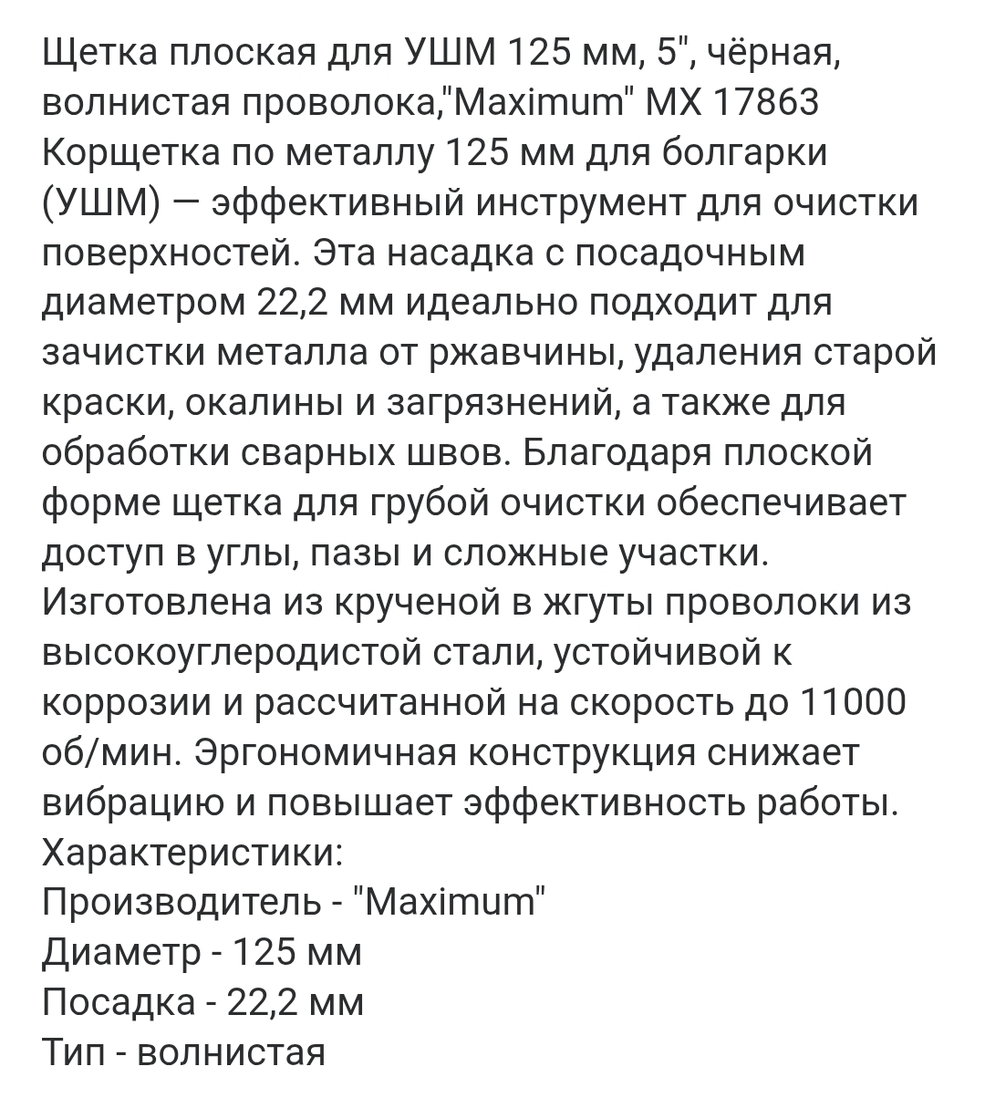 Корщетка по металлу 125 мм для болгарки (УШМ) — эффективный инструмент для очистки поверхностей. Эта насадка с посадочным диаметром 22,2 мм идеально подходит для зачистки металла от ржавчины, удаления старой краски, окалины и загрязнений, а также для обработки сварных швов. Благодаря плоской форме щетка для грубой очистки обеспечивает доступ в углы, пазы и сложные участки. Изготовлена из крученой в жгуты проволоки из высокоуглеродистой стали, устойчивой к коррозии и рассчитанной на скорость до 11000 об/мин. Эргономичная конструкция снижает вибрацию и повышает эффективность работы.