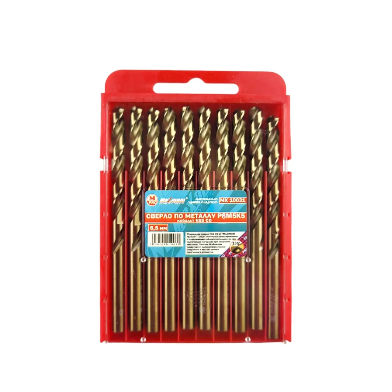 Сверла 6.5 мм для работ по металлу из стали P6M5K5 HSS CO от «Maximum Quality Tools» имеют высокий ресурс и термостойкость. Общая длина: 90 мм. Сверло из кобальта 6,5 применяется для нержавейки, титана, легированных сталей, чугуна, дерева. Добавление кобальта придает дополнительную жаропрочность – выдерживает температуру до 620-630°С. Обеспечивает быстрое и точное сверление отверстий. С данной оснасткой можно работать на повышенных скоростях резания – до 20 м/с.